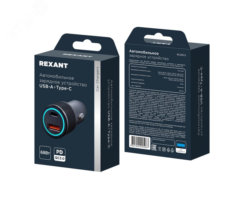 Автомобильге арналған зарядтау құрылғысы, 2 портпен (USB-C+USB-A) LED-жарықтандырумен, 68Вт REXANT, 18-2231-5