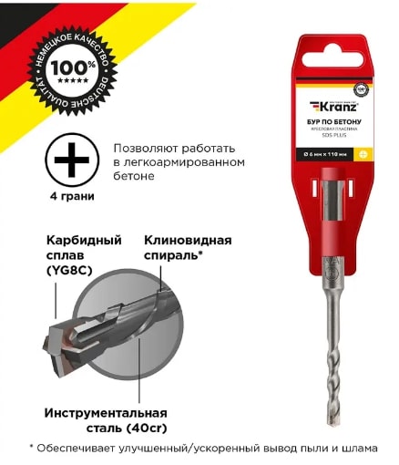 Бетон бойынша бур 6x110x50мм, айқара пластина, SDS PLUS KRANZ