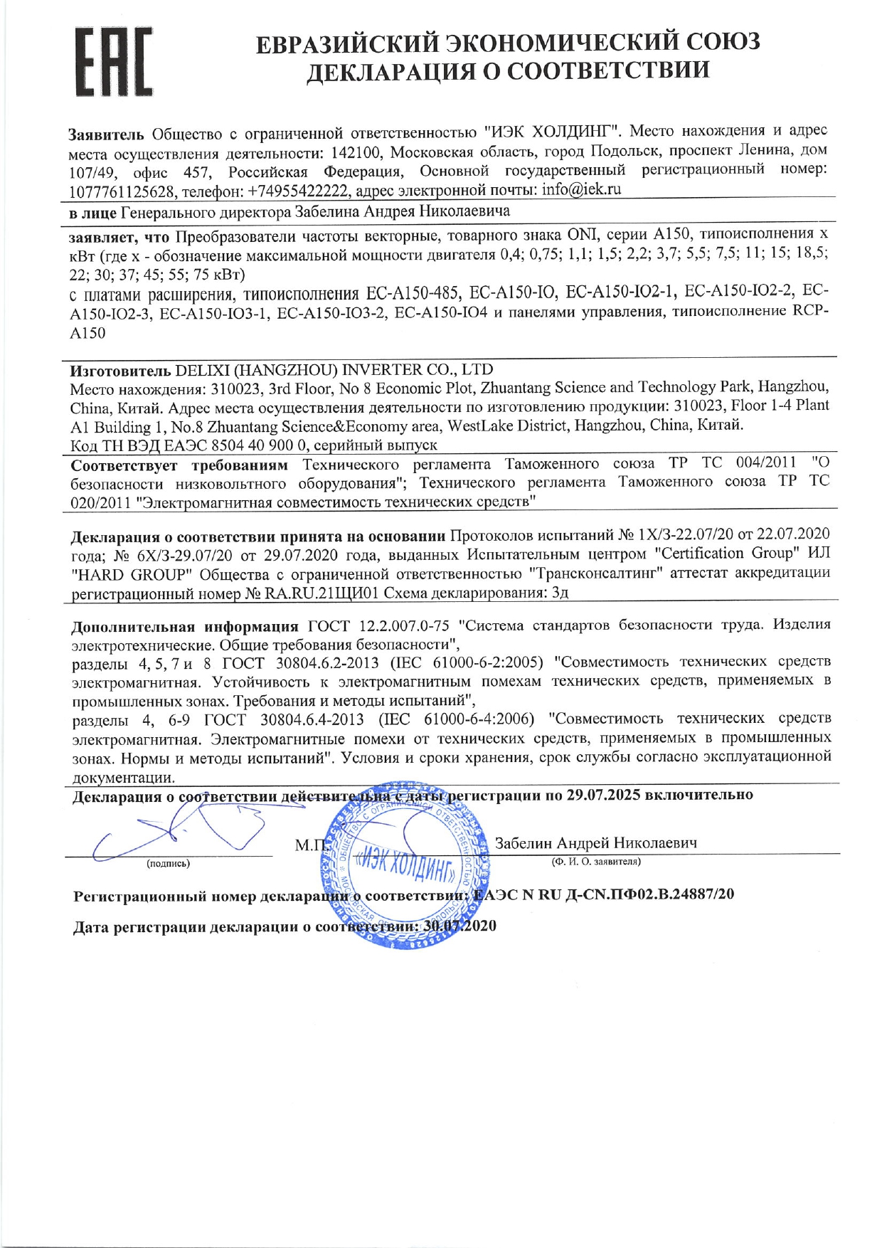 Жиілік түрлендіргіші A150 380V 3F 1,5 кВт 5А, кіріктірілген тежегіш модулі бар ONI IEK