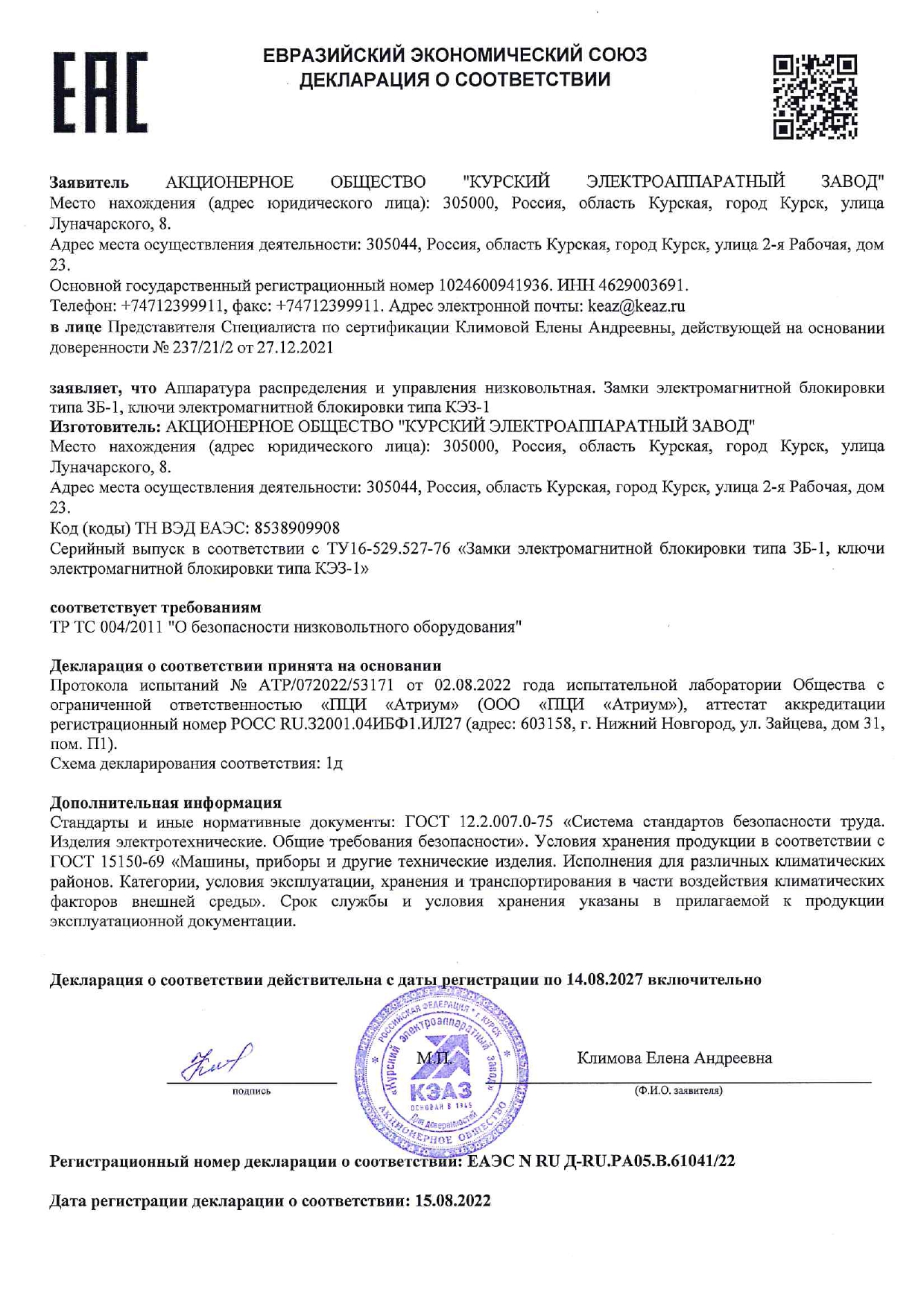 ЗБ-1 типті электромагниттік құлыптау құлыптары КЭЗ-1 типті электромагниттік құлыптау кілттері ТУ16-529.527-76 бойынша дайындалады және КО ТР 004/2011, ГОСТ 12.2.007.0 стандарттарына сәйкес келеді. ГОСТ 15150 стандарттары бойынша 3 орналастыру санатындағы УХЛ құлыптары мен кілттерінің климаттық орындалуы. ГОСТ 14255 стандарттары бойынша IP00 құлыптары мен кілттерін қорғау дәрежесі.